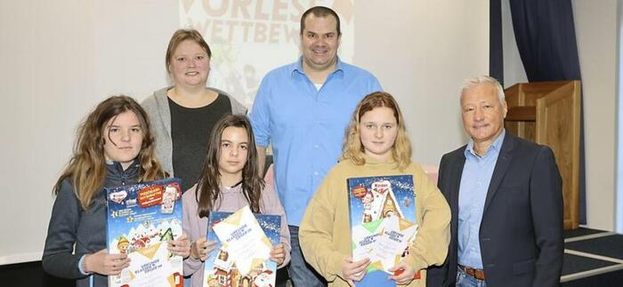 (vorne, v. li.) die Klassensiegerinnen Veronika Sattler (6a) und Lena Reusch (6b) sowie Schulsiegerin Laura Momberg (6c) mit Schulleiter Klaus Förster (re.), Lehrerin Corinna Vogl und Moderator Andreas Rauch. VF/FOTO: MK