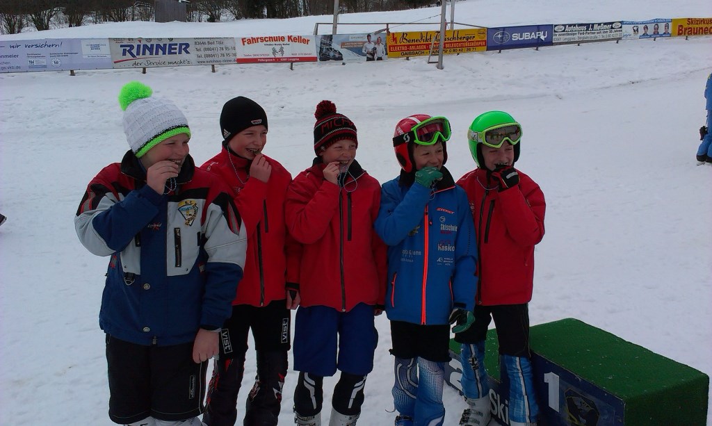 Eine überragende Vorstellung lieferten die Jungen IV am Weltcuphang in Lenggries ab. Tizian S., Felix J., Michael L., Tobias R. und Moritz K. zeigten ihr Können zwischen den Stangen in beeindruckender Weise und festigten hinter dem Werdenfels Gymnasium Garmisch und dem Finsterwald Gymnasium Rosenheim den dritten Platz, welcher zur Qualifikation für das Landesfinale ausreicht. Mit einer Gesamtzeit von 2:22,96 mussten sie sich den Rosenheimern nur 53 Hundertstel geschlagen geben. Somit war die Freude am Hang bei den zahlreich anwesenden Eltern als Zuschauer, Helfern sowie dem Betreuer Johann Fuchs groß, als bei der Siegerehrung die Stockerlplätze vorgelesen wurden. Nun können die Schüler beim nächsten Heimspiel am Lenggrieser Weltcuphang im Landesfinale zeigen, dass sie auch bayernweit konkurrenzfähig sind und eventuell mit einem Auge auf das Bundesfinale schielen... Die Realschule Bad Tölz wünscht viel Erfolg! |