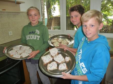 Dabei wurde der Teig geknetet, ausgewellt und ausgestochen. Die Spannung wuchs, denn während das Geschirr abgespült wurde, duftete es immer feiner in der Schulküche. Endlich war es so weit, dass die Plätzchen mit Marmelade gefüllt und mit Puderzucker bestreut wurden und sich die neuen Gruppengemeinschaften gemeinsam an den Tisch setzen konnten und ihre Meisterwerke mit Genuss „auffuttern“ durften.