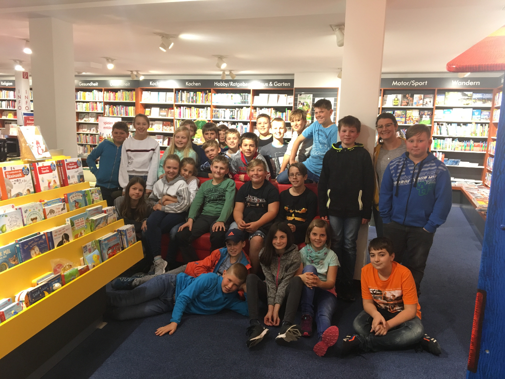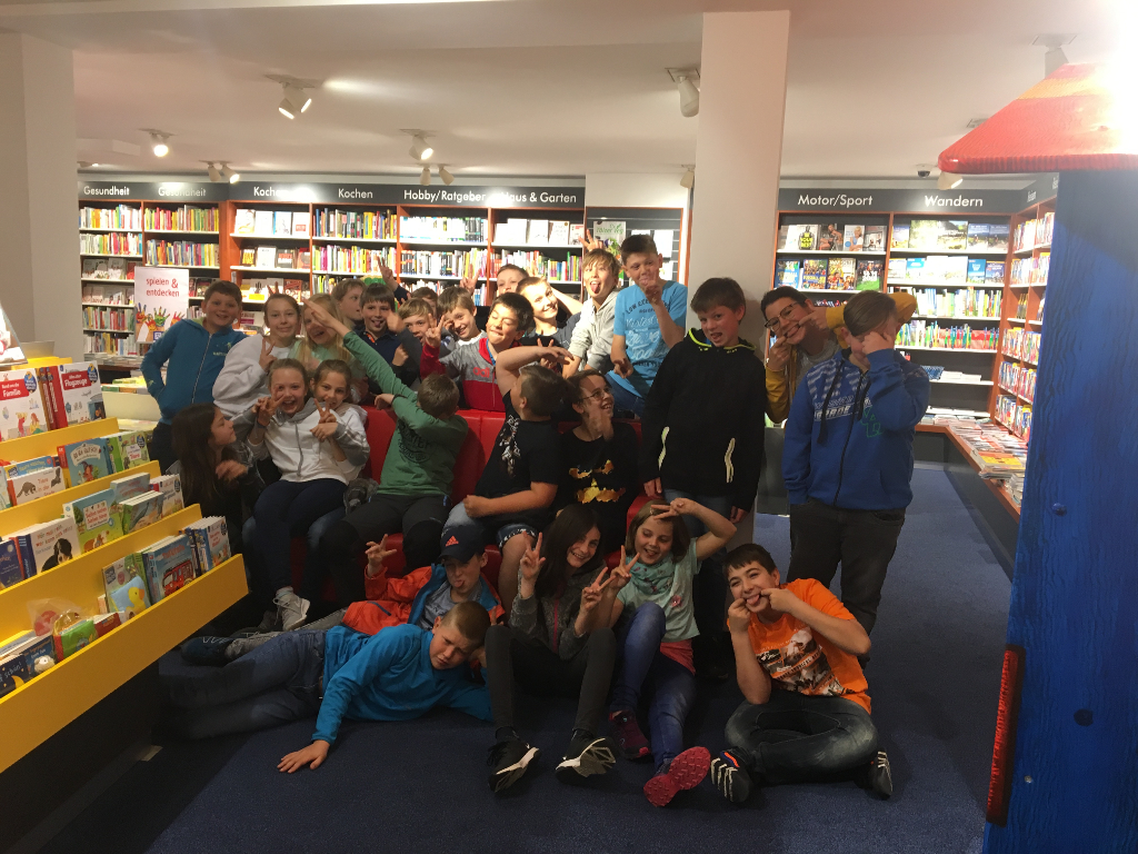 Die Schüler erfuhren von Frau Fitze Schritt für Schritt wie ein Buch entsteht und ihnen wurden interessante Rekorde zu Büchern berichtet. Beispielsweise, dass das kleinste gedruckte Werk so groß wie ein Cent-Stück ist. Des Weiteren erhielten sie spannende Buchtipps und durften selbst in den Reihen der Buchhandlung schmökern. Zum Schluss füllten sie ein Quiz aus und bekamen die Geschichte „Der geheime Kontinent“ geschenkt. Danach ging es zur Eisdiele und jeder Schüler erhielt eine Kugel Eis. Die Geschichte wurde gemeinsam in den folgenden Klassenleiterstunden gelesen und die Schüler nahmen am Kreativwettbewerb teil. Hoffentlich klappt es mit dem Gewinn!