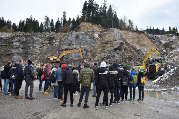 Bei der nächsten Station des Rundgangs über den Steinbruch erläuterte Herr Willibald, wie eine Sprengung mit Millisekunden erfolgt, um lediglich das Gesteinsgefüge zu lockern, jedoch keine Steine zu zerstören oder gar Gebäude der Anwohner zu beschädigen. Während alle aufmerksam den Ausführungen von Herrn Willibald lauschten, konnten Baggerfahrer beim Sortieren von Steinen nach Größe und Qualität beobachtet werden. Die Heranwachsenden erfuhren auch, wofür diese Abbauprodukte im Anschluss verwendet werden – etwa im Straßen- und Tiefbau, als Stützmauern entlang von Straßen, als Gartenmauern oder um Siedlungsgebiete in der Region vor tosenden Wildbächen zu schützen. Herr Willibald betonte hierbei besonders die Versorgung der regionalen Bauwirtschaft mit Gesteinen, da dies zum einen Arbeitsplätze in der Region schaffe, zum anderen aber auch straßen- und umweltschonender als ein Transport von weither sei.
