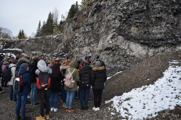 Auf den Spuren der Geologen waren die Klassen 9b und 9c zusammen mit den Lehrkräften Herrn Huber, Frau Vogl und Frau Lipp bei ihrer Exkursion in den Steinbruch Hellerschwang in Lenggries. Nach einer kurzen Begrüßung und Einleitung durch Herrn Huber brachte Herr Kilian Willibald den Schülerinnen und Schülern bei einem Rundgang über seinen Natursteinbruch eindrucksvoll den Abbau von Platten- und Korallenkalk im Sprengbetrieb näher.