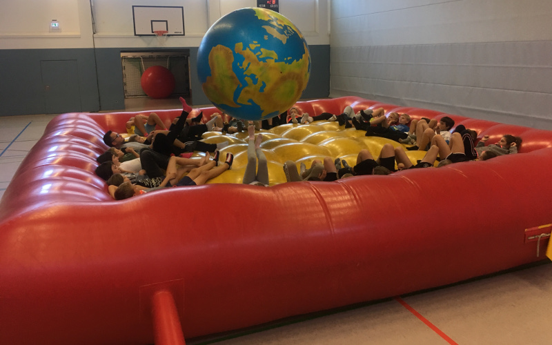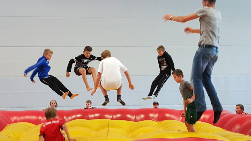 Nach dem Mittagessen wurde erstmal das Gelände in Form einer Camprallye erkundet. Anschließend ging es auch schon zu den ersten Spielen, die den sportlichen Teamgeist im Fokus hatten. So galt es zum Beispiel beim AirTramp einen Riesenball mit den Füßen ins gegnerische Aus zu befördern oder beim Biathlon Ausdauer beim Laufen und Geschick beim Schießen mit dem Lasergewehr unter Beweis zu stellen. Nach so viel sportlicher Betätigung hat das Essen anschließend besonders gut geschmeckt. Doch der erste Abend hielt noch eine weitere Überraschung bereit. Aufgeteilt in Teams von 8 – 12 SchülerInnen fand nach dem Abendessen das große „Spiel ohne Grenzen“ statt. An verschiedenen kreativen Stationen konnten alle SchülerInnen aller Schulen des Camps nochmals ihre Geschicklichkeit und Sportlichkeit unter Beweis stellen.