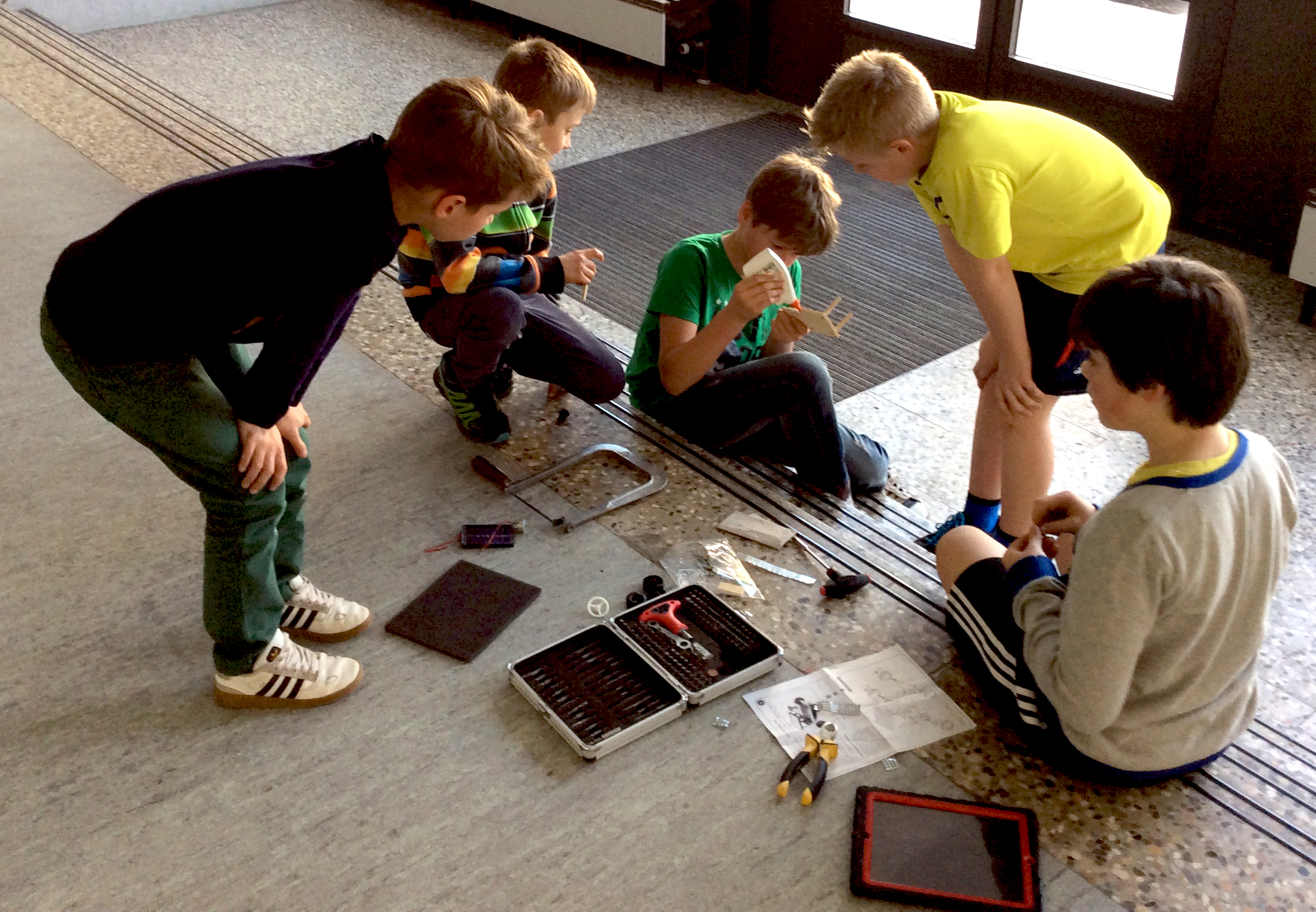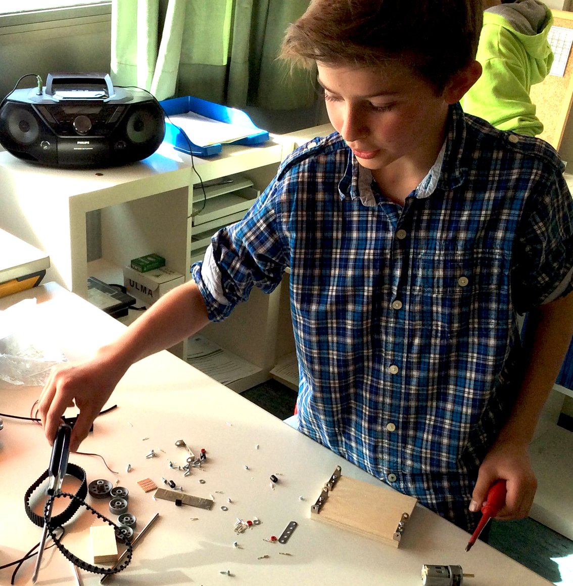 Die SchülerInnen präsentieren in Form eines selbst gedrehten Films den Zusammenbau eines technischen Bausatzes. Jedes Team besteht aus einem Konstrukteur, einem Kameramann und einem Moderator. Die Auswahl des Technik-Bausatzes, das Drehbuch, die Filmerstellung und der Schnitt werden von den SchülerInnen im Team selbstständig organisiert und durchgeführt. Die Kinder haben die Möglichkeit, die iPads mit nach Hause zu nehmen, damit sie auch außerhalb der Unterrichtszeit an ihren Ideen weiterarbeiten können. Neben dem Umgang mit neuen Medien, werden mit diesem Projekt vor allem auch die Sprach- und Sozialkompetenzen gefördert.